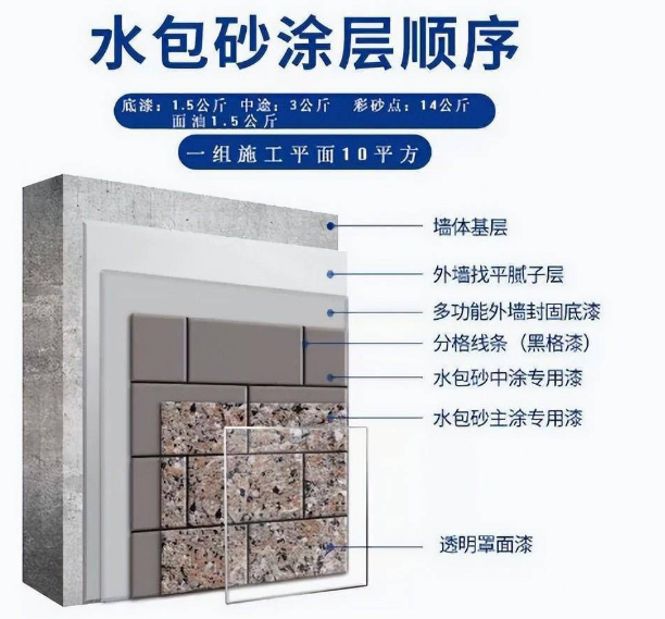 水包砂—— 水包砂也是一种多彩涂料,不过它包含了两种——水包水涂料和真石漆。水包砂摸上去是不平的,它有一种凹凸感,因为它是用乳液包裹着彩砂。摸上去好像有凹凸不平的小石头。涂刷了水包砂的表层是麻面的,而水包水是光滑的;水包砂可以说是水包水和真石漆的合二为一的升级产品,三者的表面质感不同,水包砂既有荔枝面的天然石头的质感,又有仿花岗岩的效果;而水包水多彩涂料具有表面光泽,但没有荔枝面天然石头的质感。